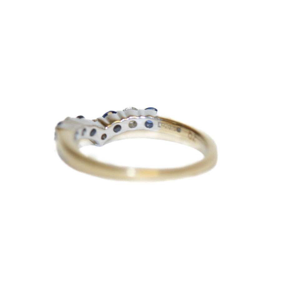 A graceful 9ct yellow gold wishbone ring set with deep blue sapphires and sparkling diamonds.